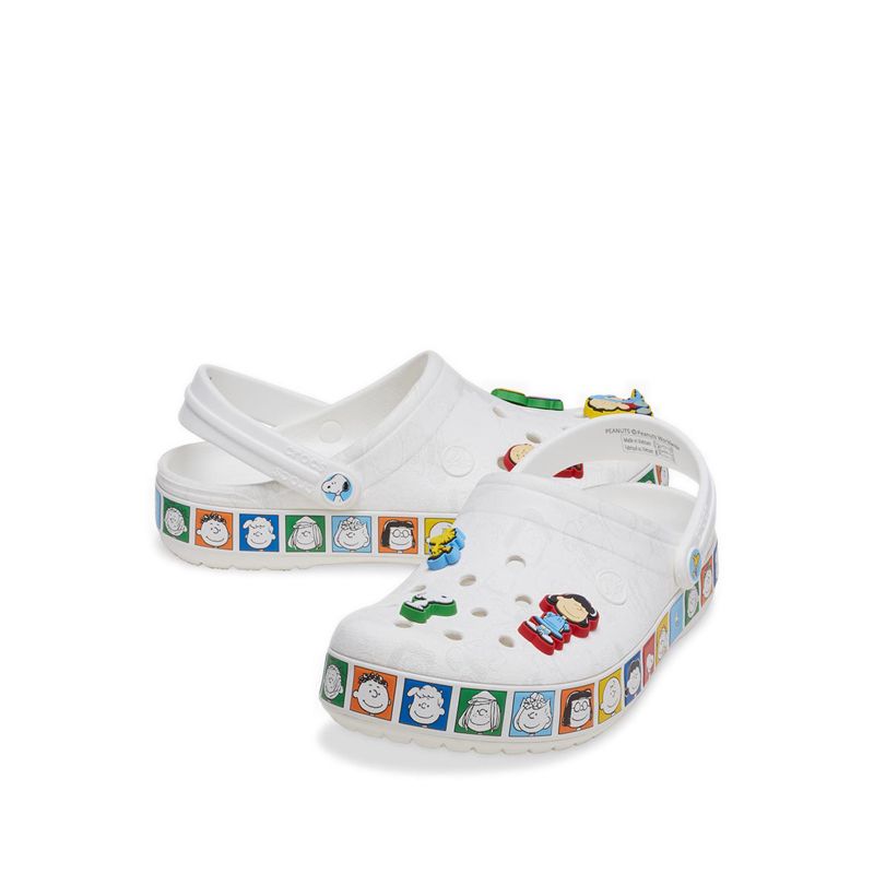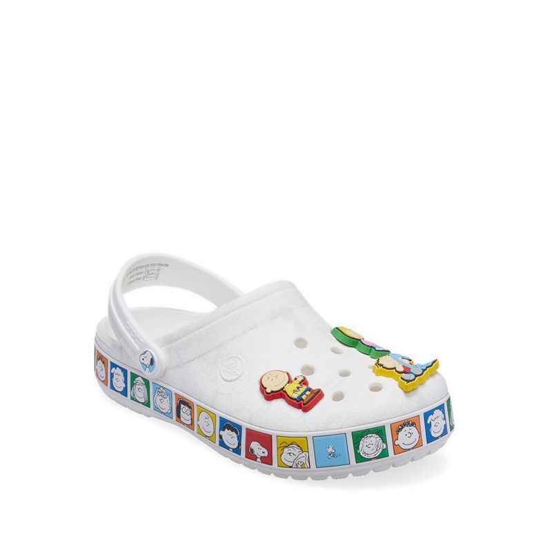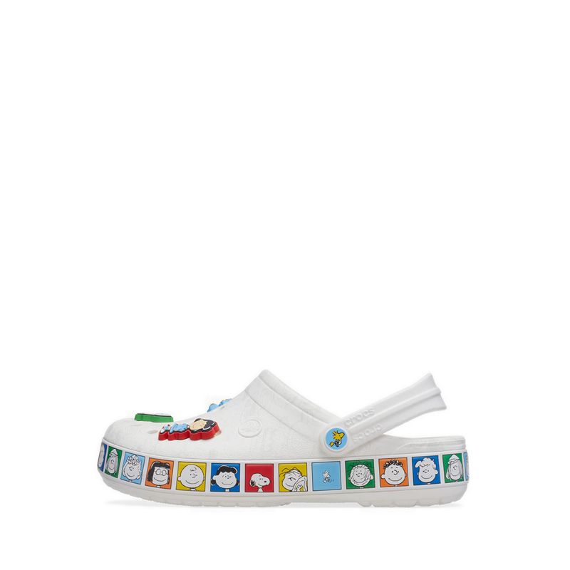 The whole gang is here! The Peanuts™ Crocband Clog features a subtle character print across the upper, contrasted by colorful character portraits around the sole including Peppermint Patty, Marcie, Franklin, and more. The upper is decorated with Jibbitz™charms featuring Charlie Brown, Snoopy, Lucy, Linus, Sally, and Woodstock. This kicked back style is an easy, everyday slip-on with playful pops of color and fun elements of Peanuts™ nostalgia.